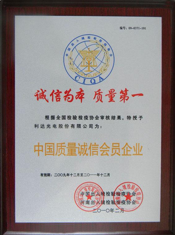 利達光電股份有限公司榮獲首批“中國質(zhì)量誠信會員企業(yè)”榮譽稱號