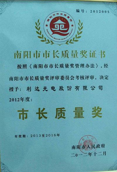 利達(dá)光電榮獲2012年度南陽市“市長質(zhì)量獎”